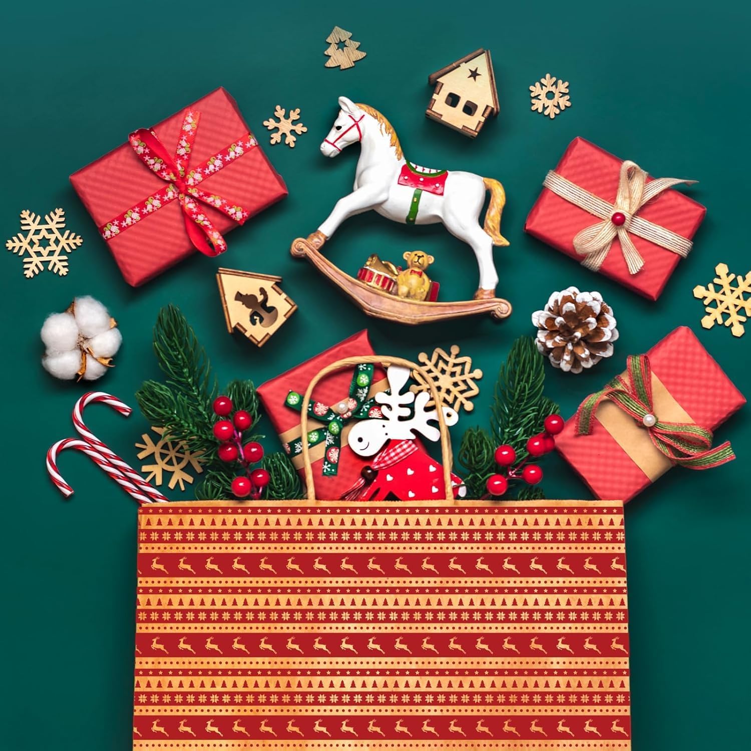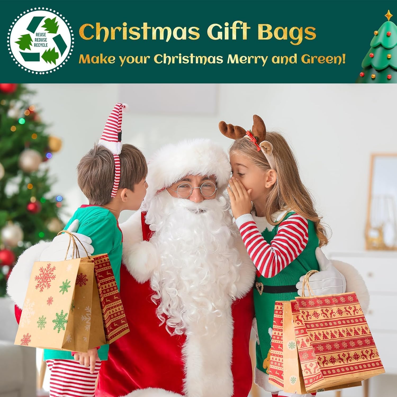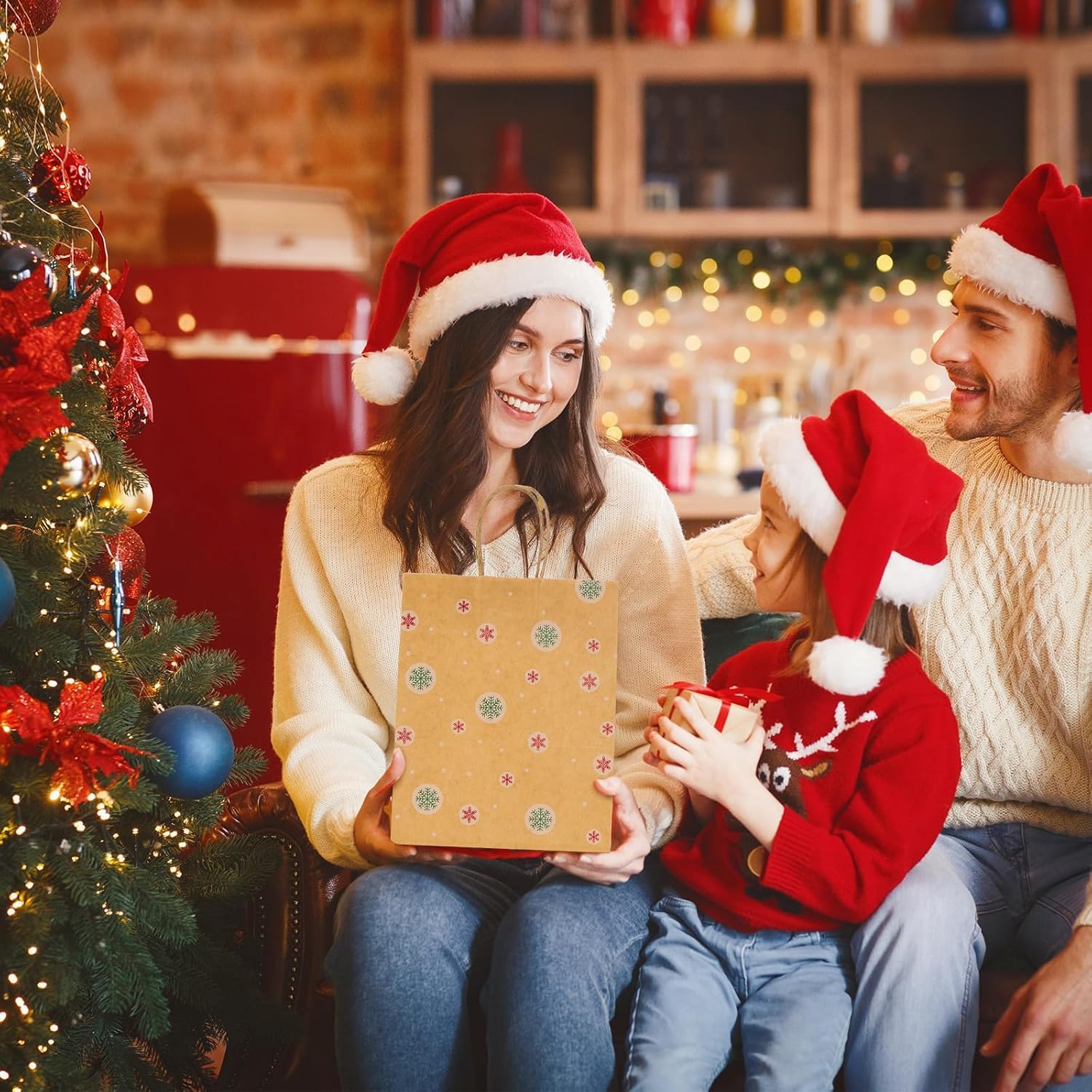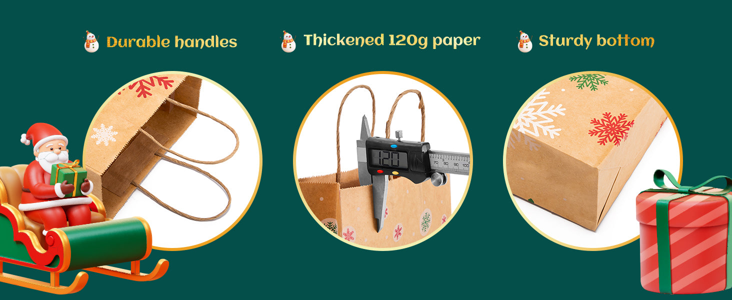 【Heavy Duty 120G Xmas gift bags】 - Made with 120gsm kraft paper, more thick than other paper gift bags. Handle design is easy to grip, you can rest assured that your gifts are safely wrapped in the bag. The reinforced bottom and perfectly glued handle provide extra support. Craft bags is sturdy enough to carry all kinds of your Christmas presents.