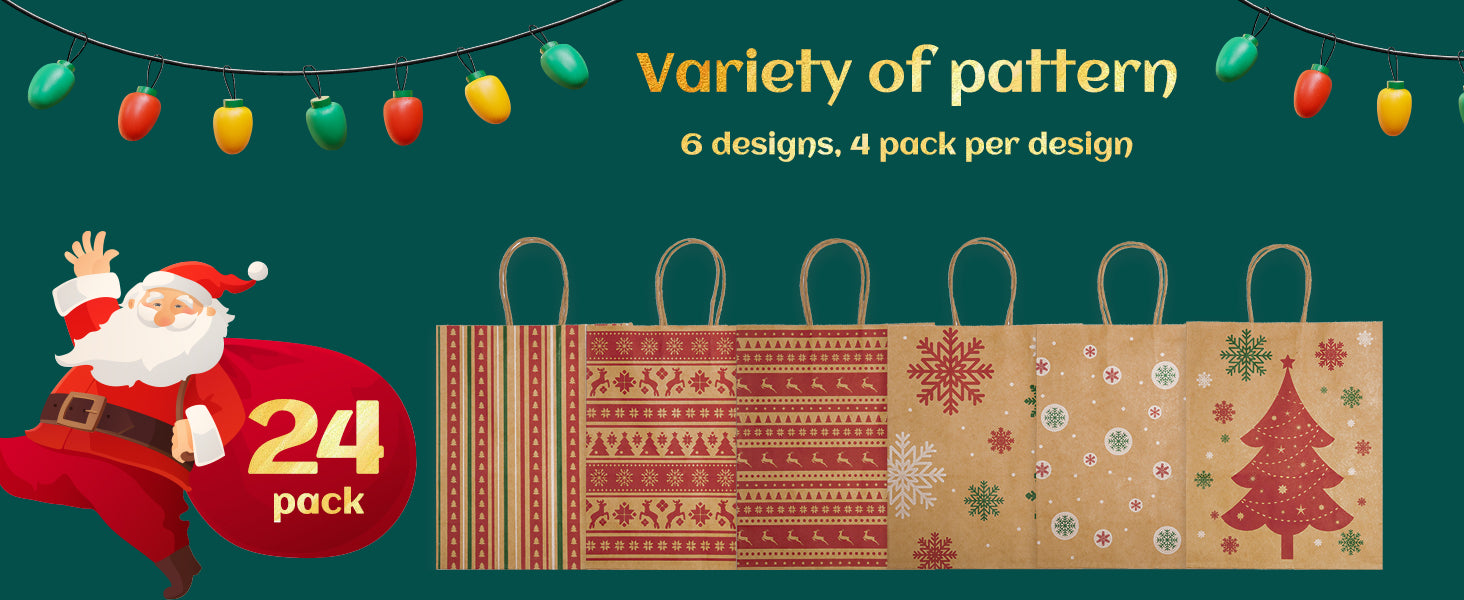 【Unique design Christmas Gift Bags】 - Party bags size in 7x8.6x3.3 inches (21.8X17.8X8.4cm) , 6 designs (each design 4pcs,total 24pcs). Kraft bags designs in snowflake, Christmas tree and elk ect,let our paper bags accompany you for a special Christmas. They are essential for Christmas party decorations and ideal for wrapping gifts for family and friends.