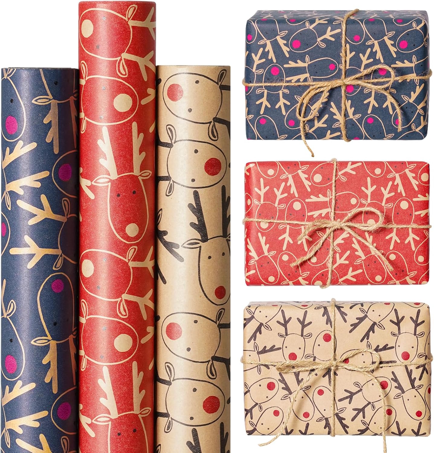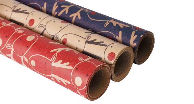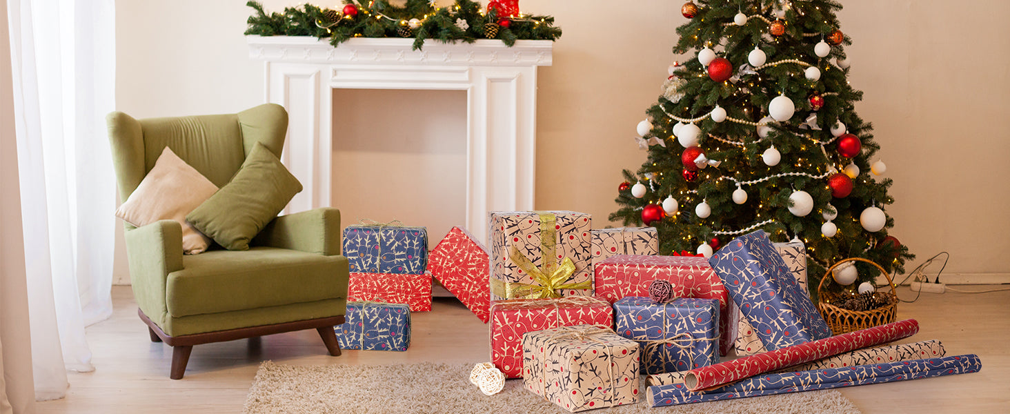 Size: Including 3 rolls of packaging paper, each wrap paper roll is 60 cm x 500 cm. 3 colors: brown, blue, and red. This xmas wrapping paper makes it easy to wrapping gifts in different sizes and great for multiple presents.