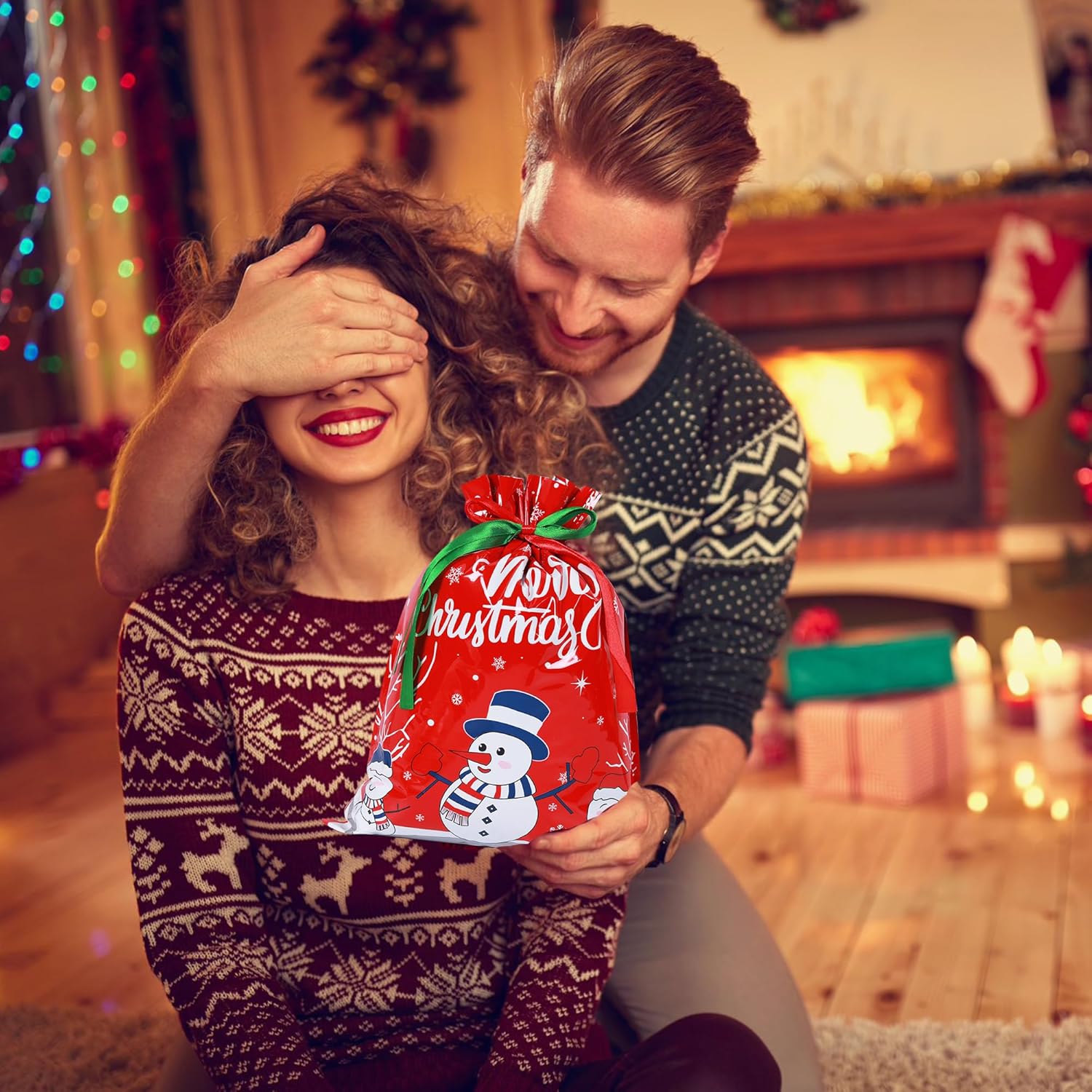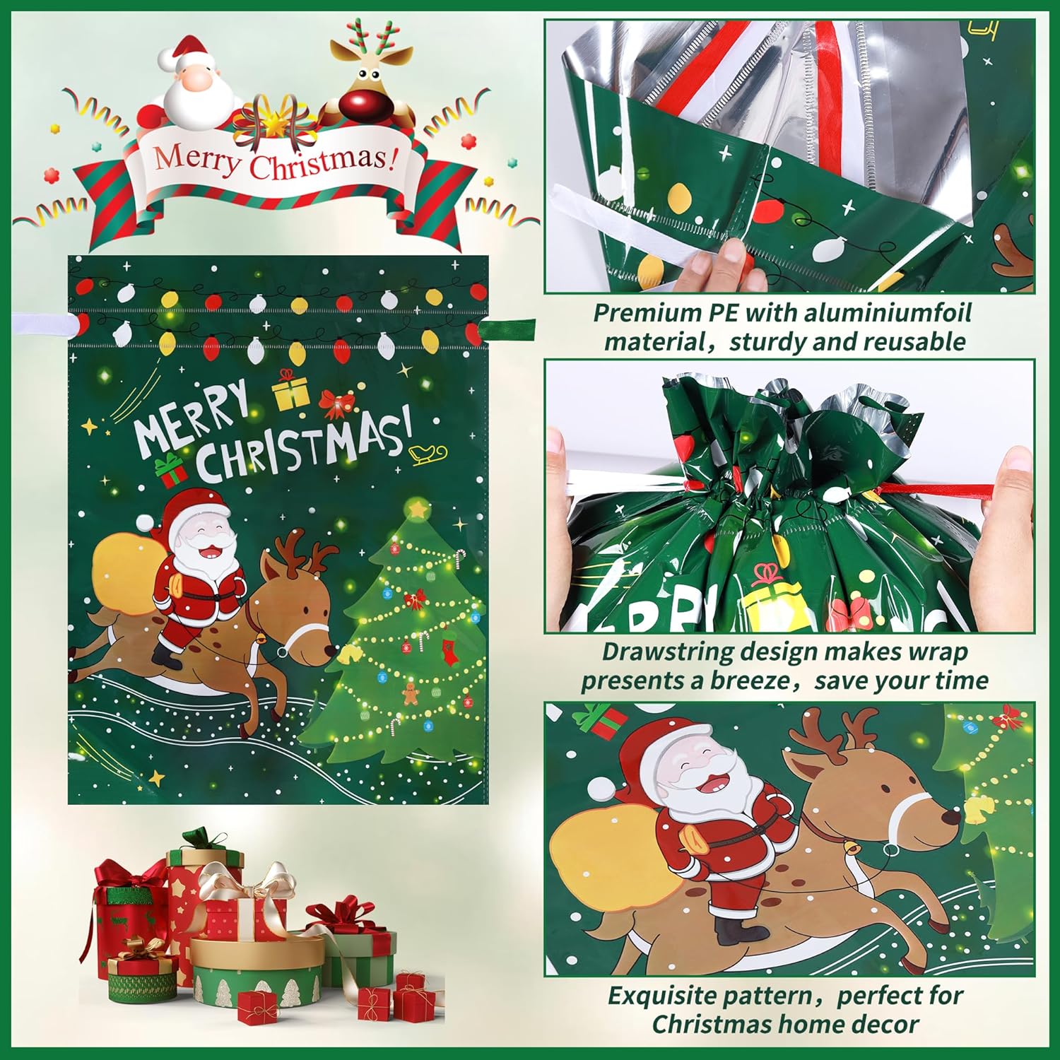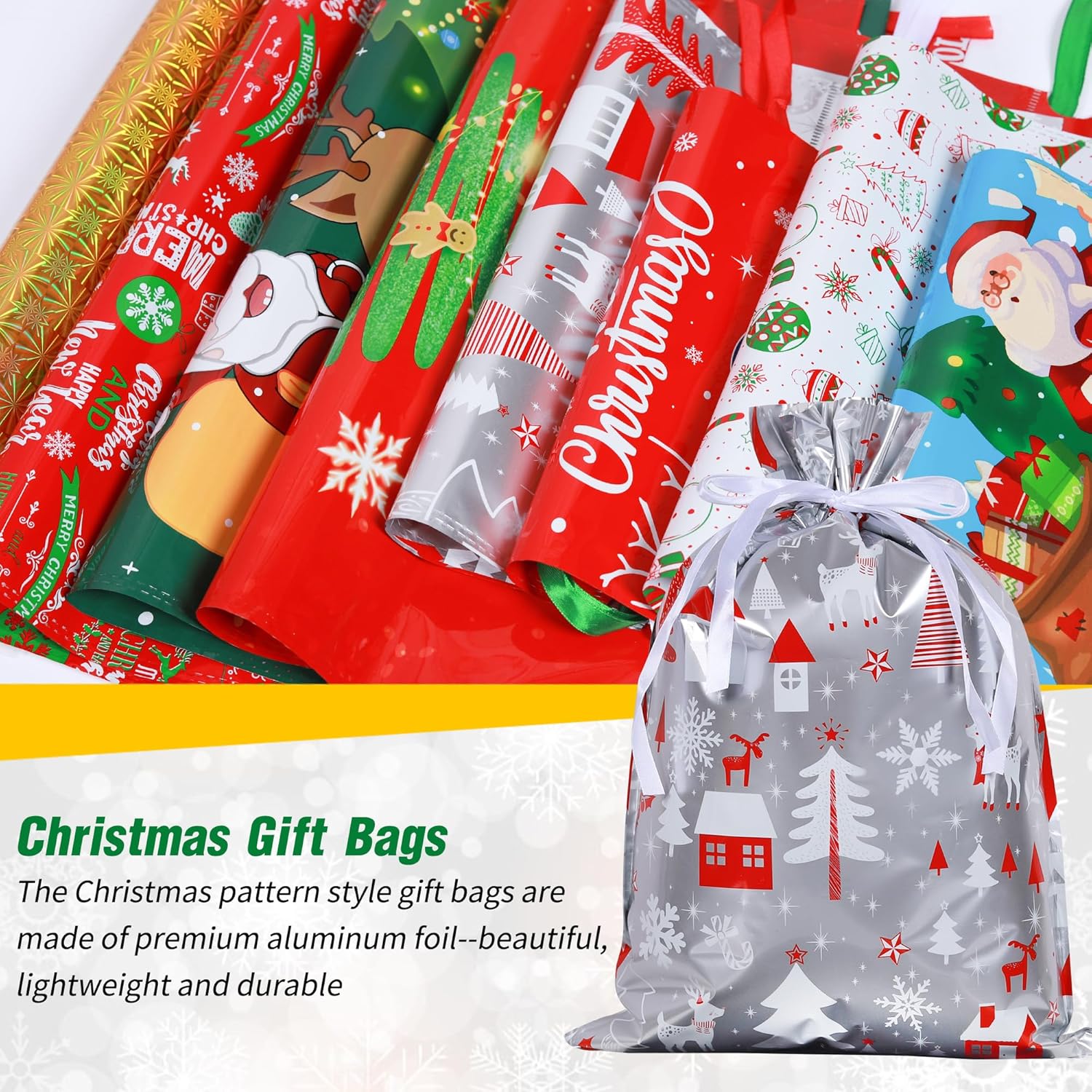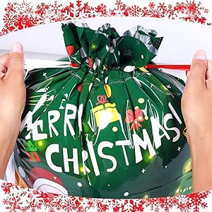 【Easy to Use】: The gift bag is easy to use, just put the gift in the bag, pull the ribbon, tie a bow and you are done. You can skip the hassle of wrapping paper, tape, ribbon, save your time, it's very convenient. Christmas drawstring bags are the perfect alternative to wrapping paper.