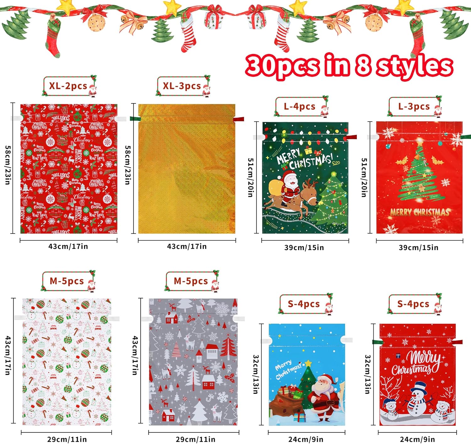 【Christmas Gift Bags Assorted Sizes】: You will get 30 xmas gift bags of various sizes. Extra large (58x43 cm, 5 pcs), large (51x39 cm, 7 pcs), medium (43x29 cm, 10 pcs), small (32x24 cm, 8 pcs) and 8 different styles of Christmas pattern designs for packaging Various Christmas gifts.