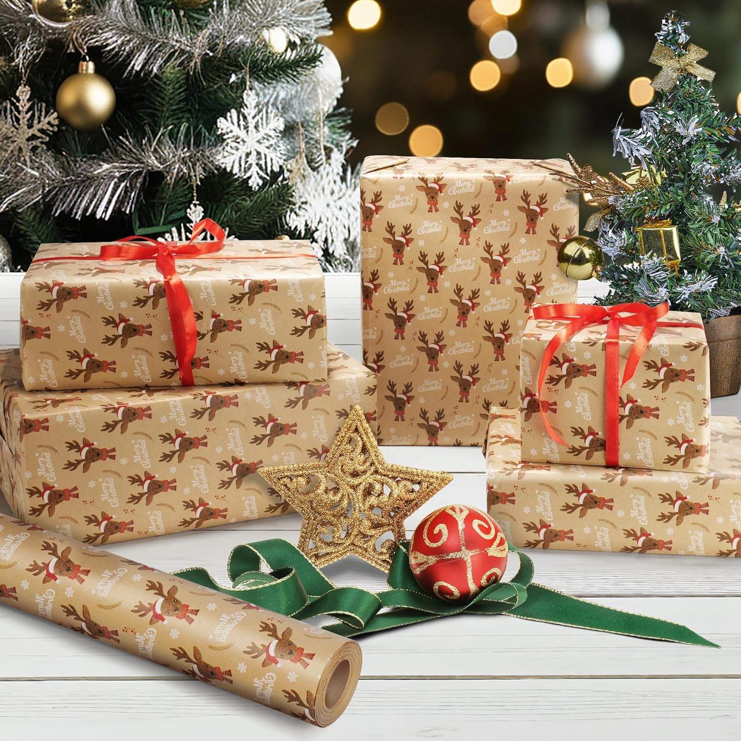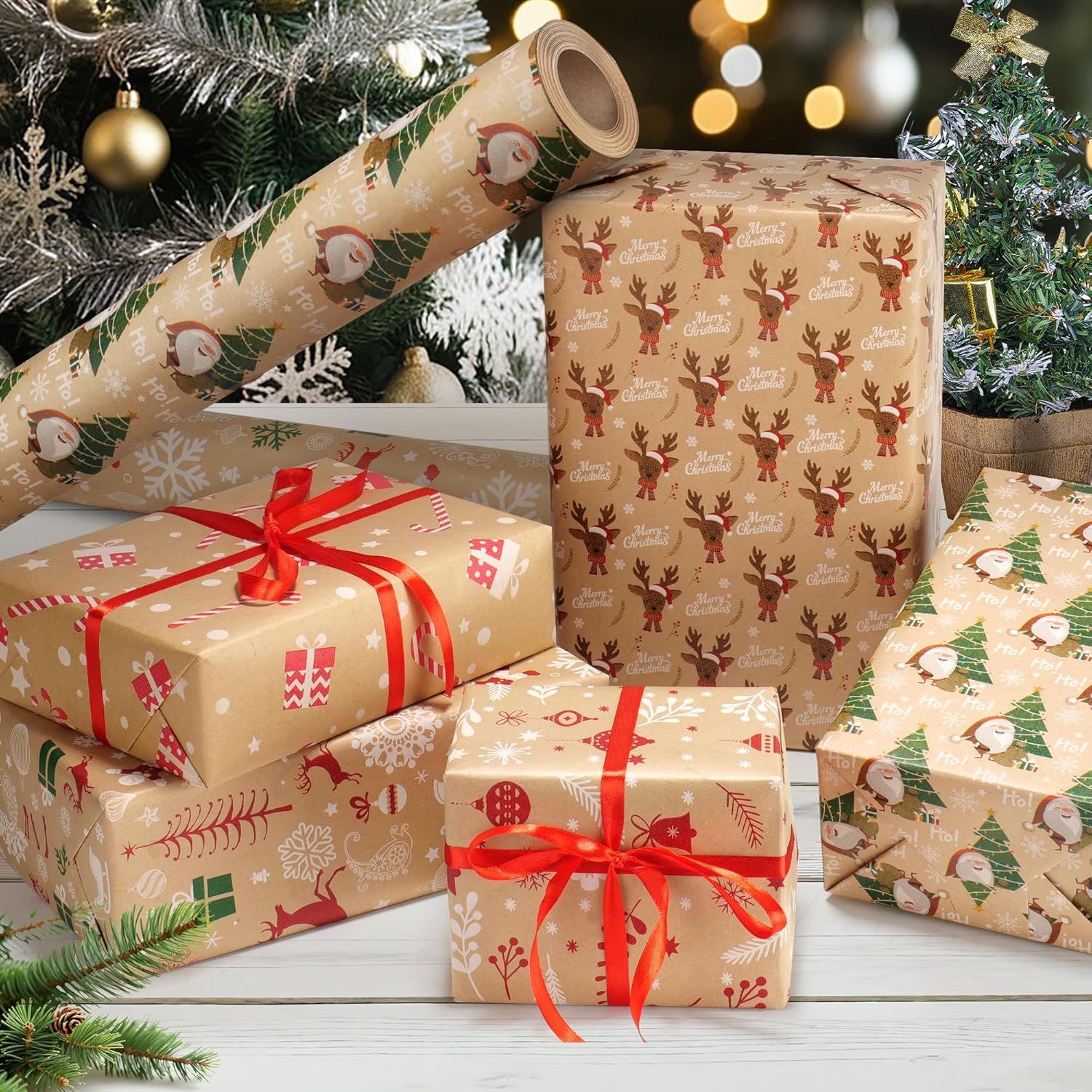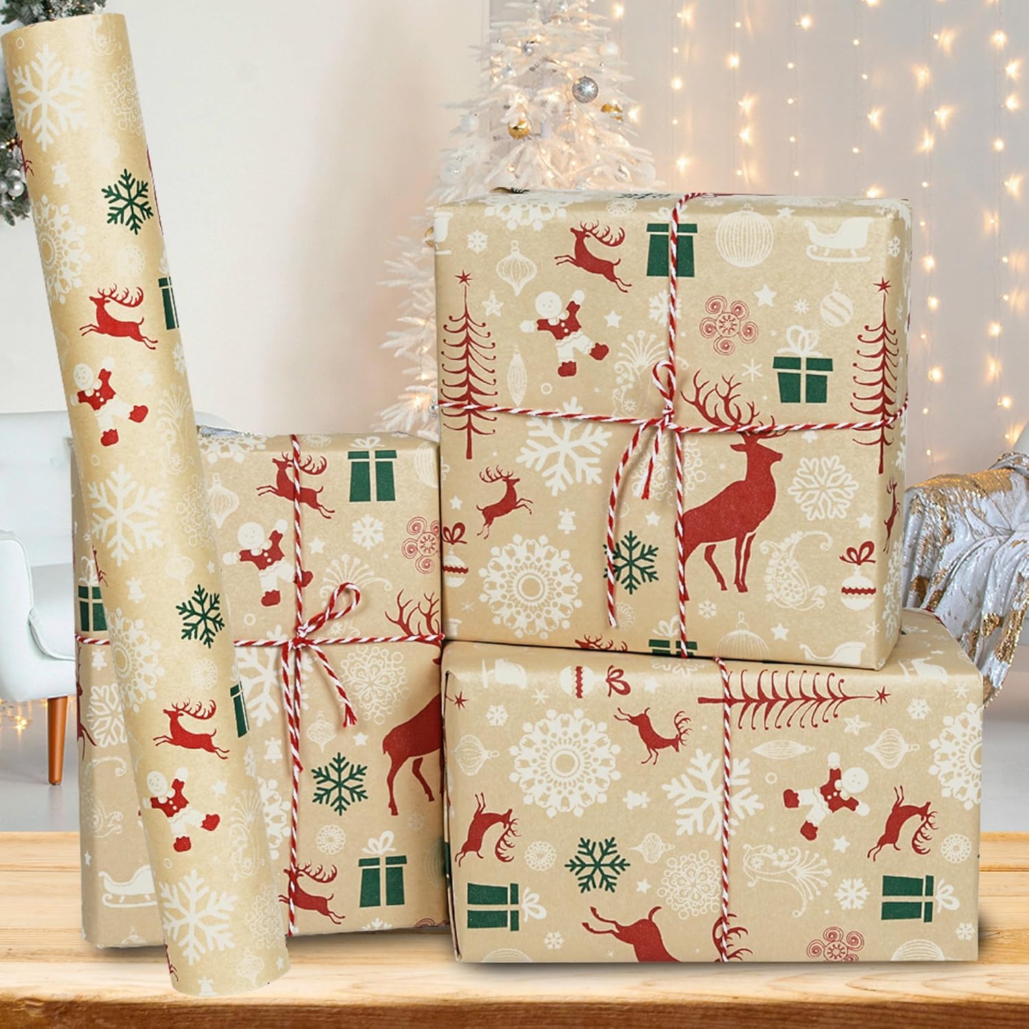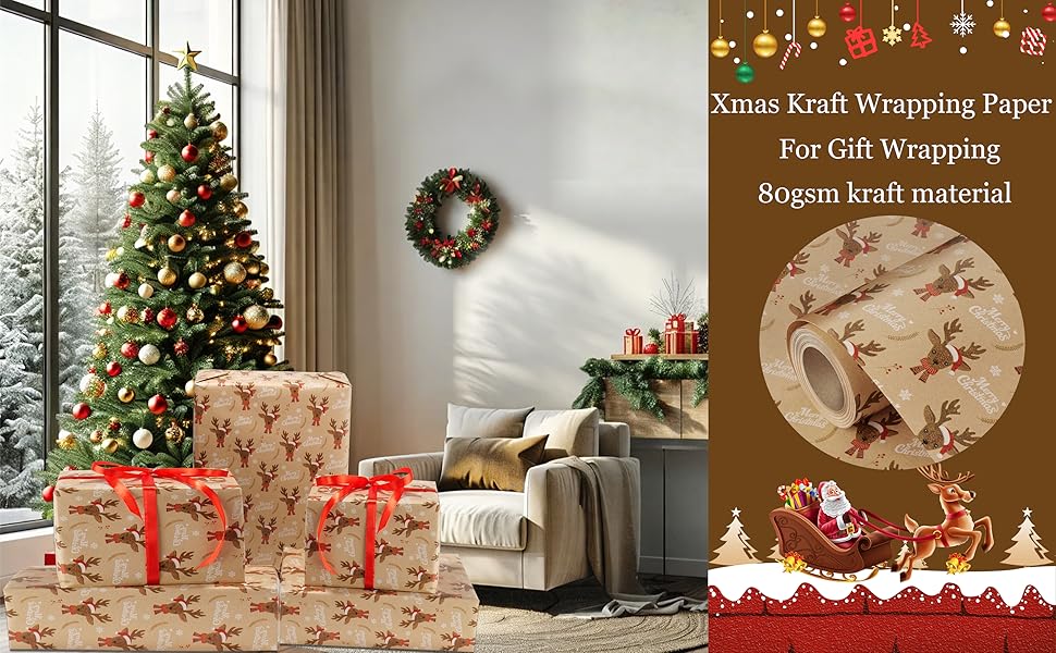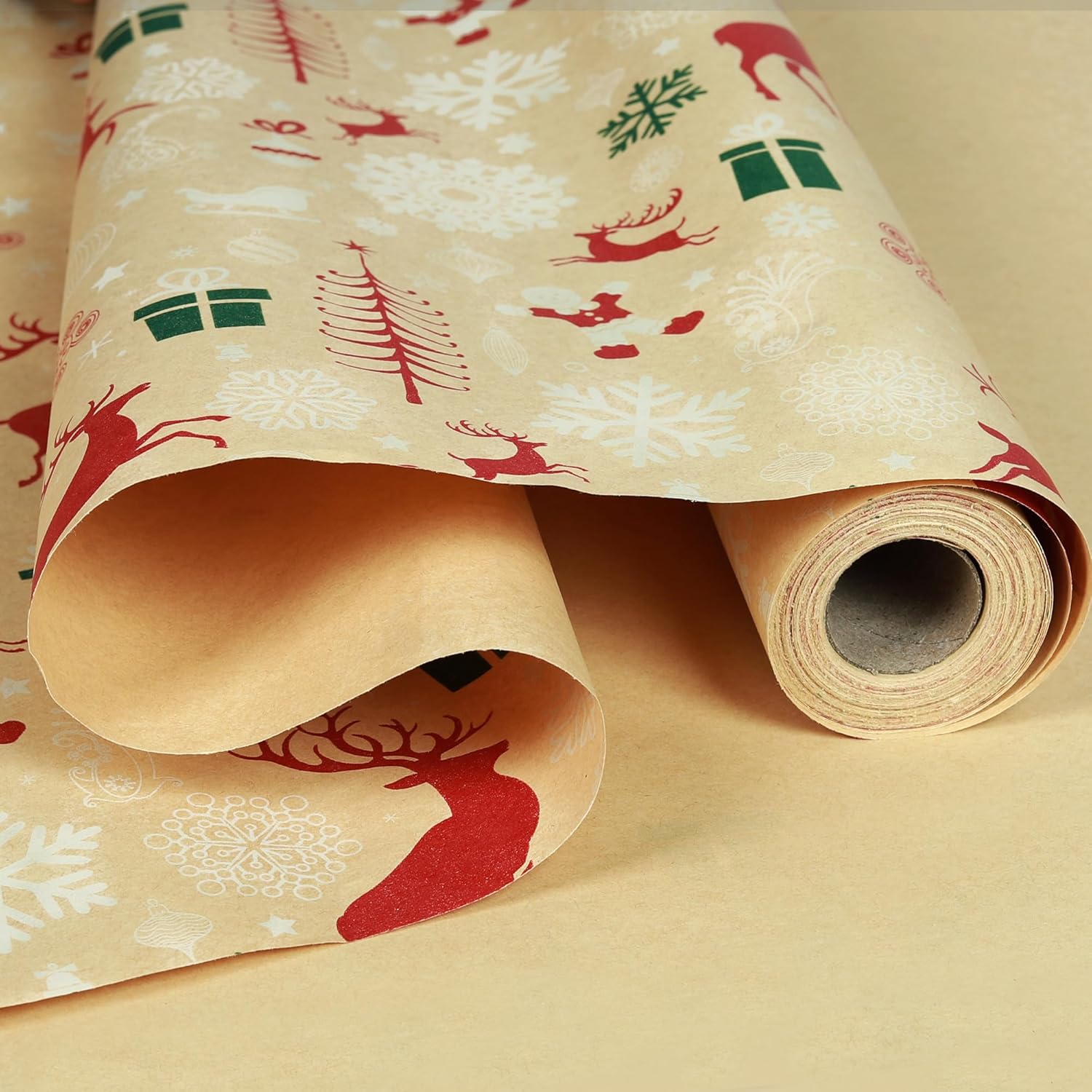 【Unique Design Paper】The kraft Christmas wrapping are printed with Christmas element,as Elk, snowflake, Christmas tree etc. The design will make your gifts more eye-catcher in your party.