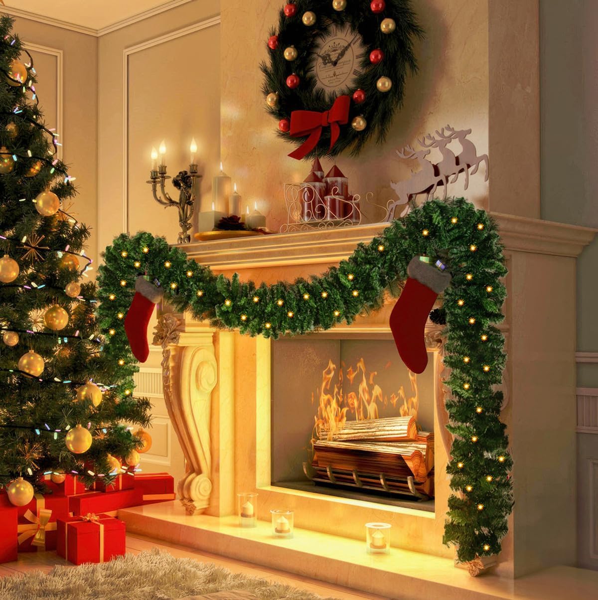 【5M/16.4FT Artificial Garland】These extra-long garlands are 5 meters long. Flowers and christmas balls of different sizes are intertwined in the garlands. This christmas garland light is equipped with 100 LED lights to create a festive atmosphere for your room.