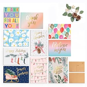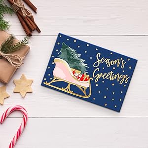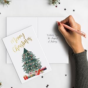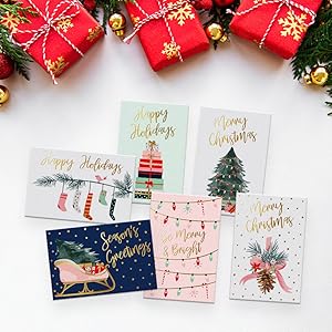• Rich, vibrant design: Sure, they are the thickest Christmas cards on Amazon; they can also be the most classic. This set contains 24 cards in 4 gold foil designs with a beautiful message inside. With a set of cards like this, everyone feels like you have splurged on an expensive Christmas card just for them