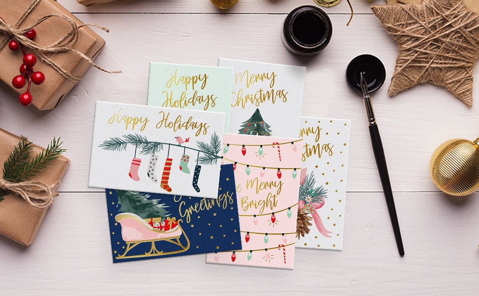 • FESTIVE, NOT FLIMSY: It sounds childish, but most people agree that Christmas cards are either cool or cheap and sticky. Only cool cards get a place of honour above the fireplace. That is why we have developed a set of 24 thick Christmas cards with elegant gold foil designs, so your cards will last the entire holiday season