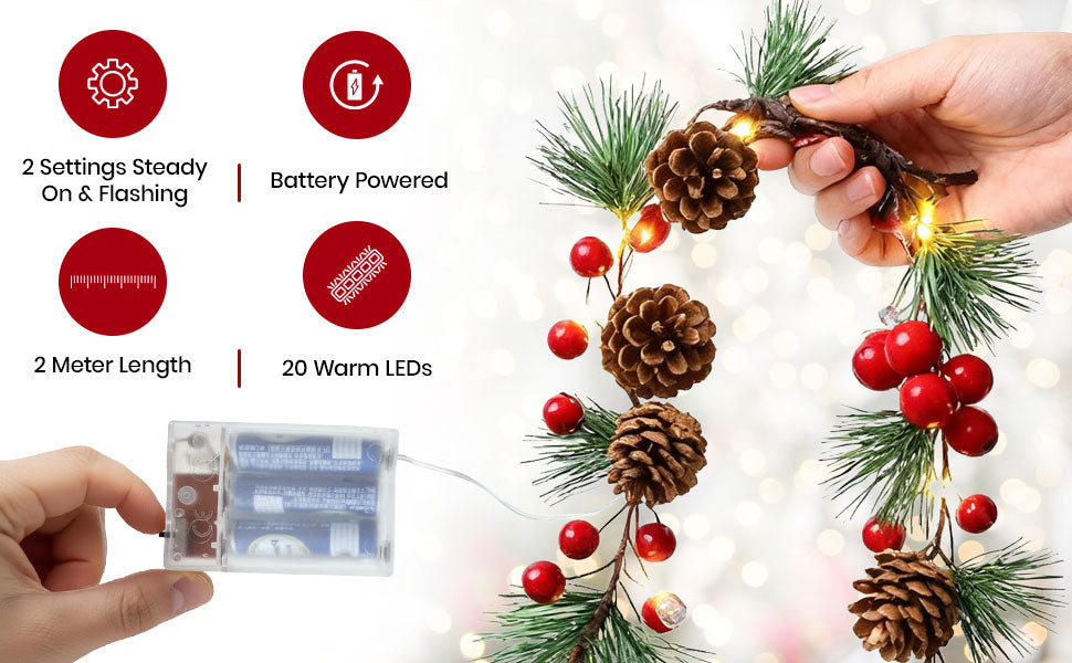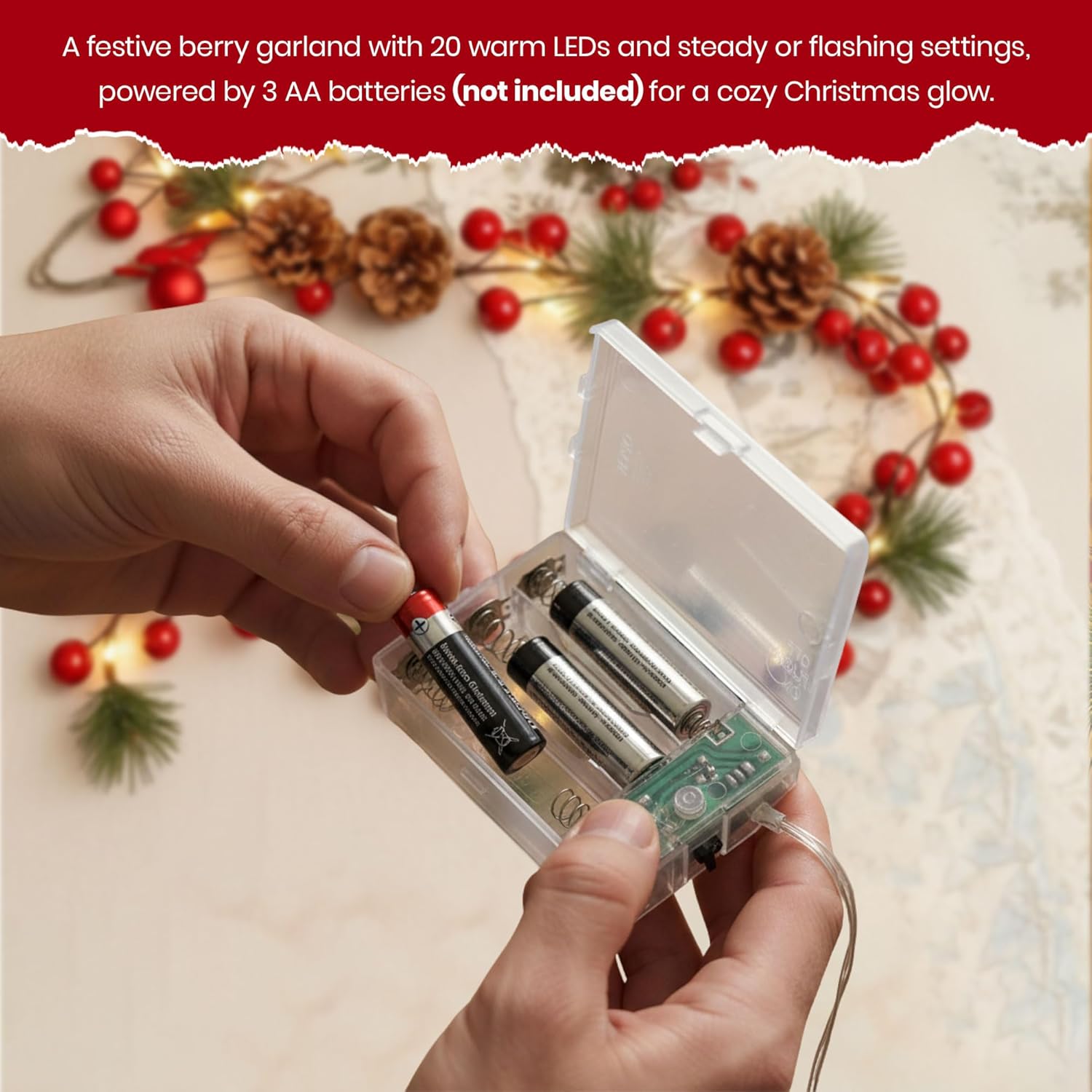 Berry Garland with Lights; With 20 warm LEDs and 2 settings steady on and flashing the Xmas garland needs 3 AA batteries (not included) a Christmas string garland is a great addition to Xmas Decor