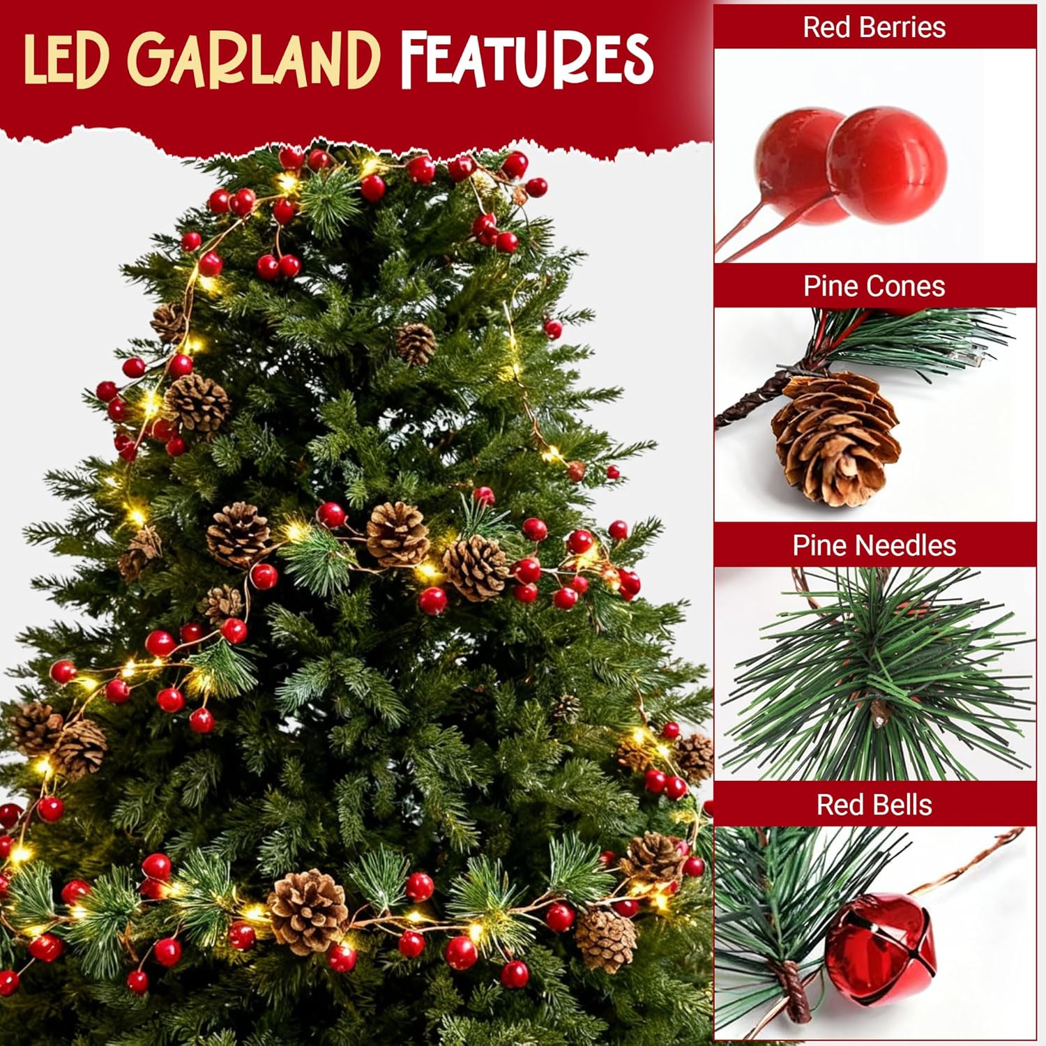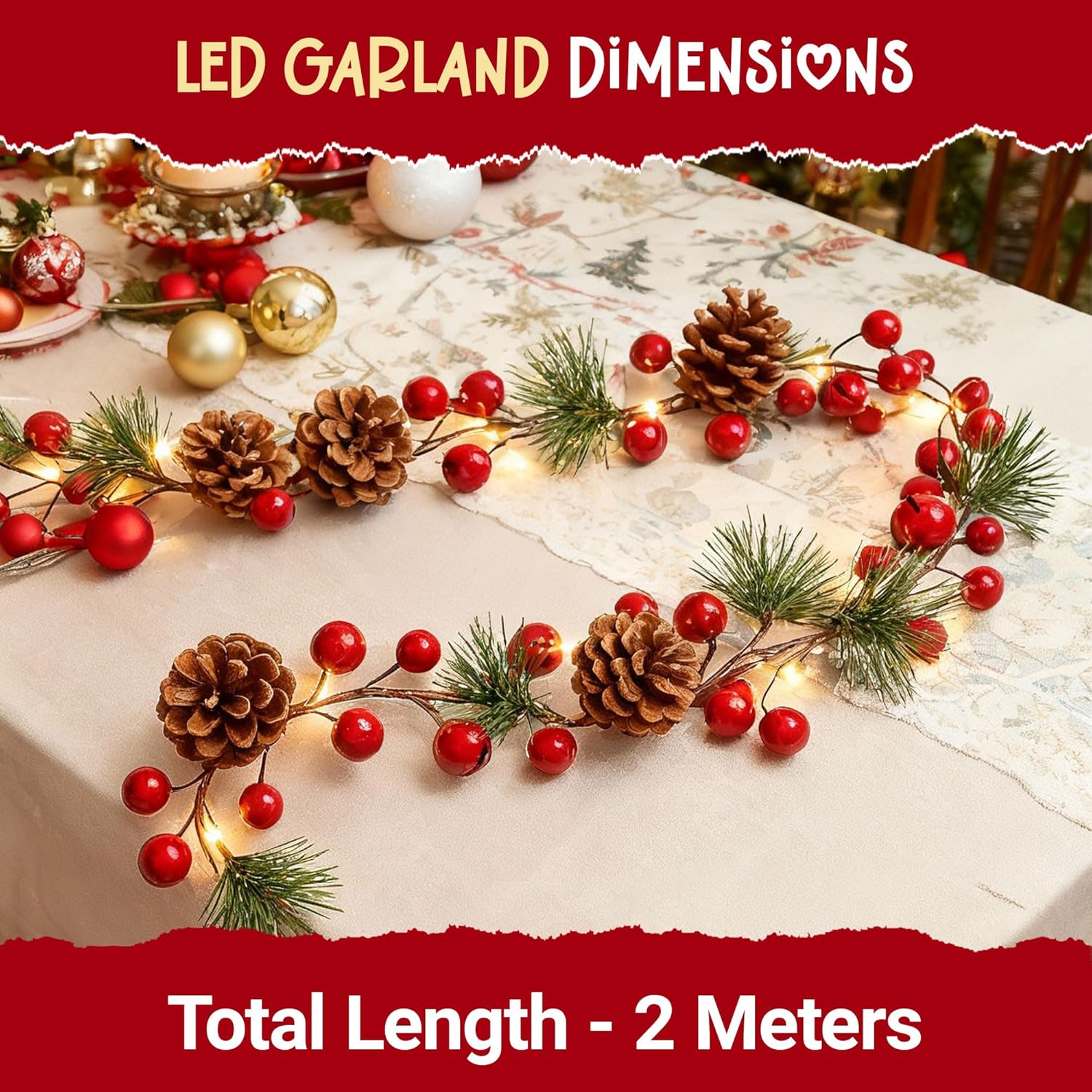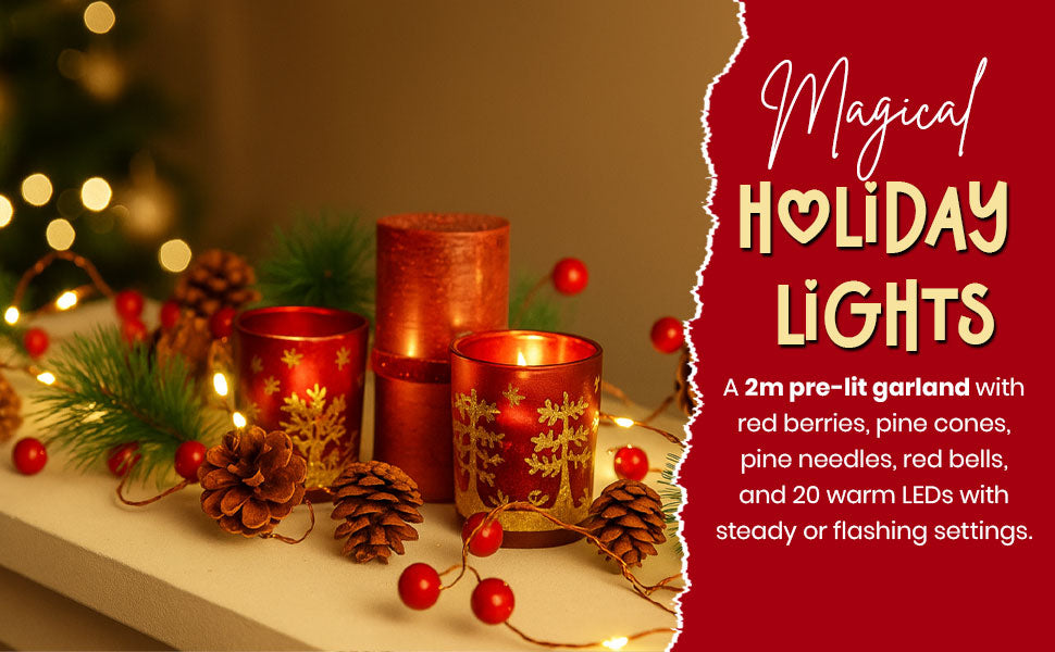 Light Up Garland Christmas; A 2m pre lit garland with red berries, pine cones, pine needles and red bells, use as a Christmas light garland for stairs, fireplace garland or mirror garland Christmas