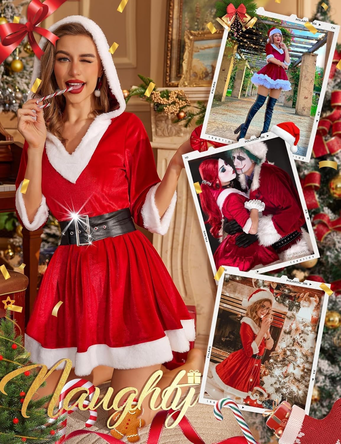 Classic Design: Christmas sexy costume boasts a timeless design. Featuring a classic A-line silhouette and an attached hood with furry trim, it exudes a cozy Christmas vibe. V-neckline enhances your curves, making you feel irresistibly sexy.