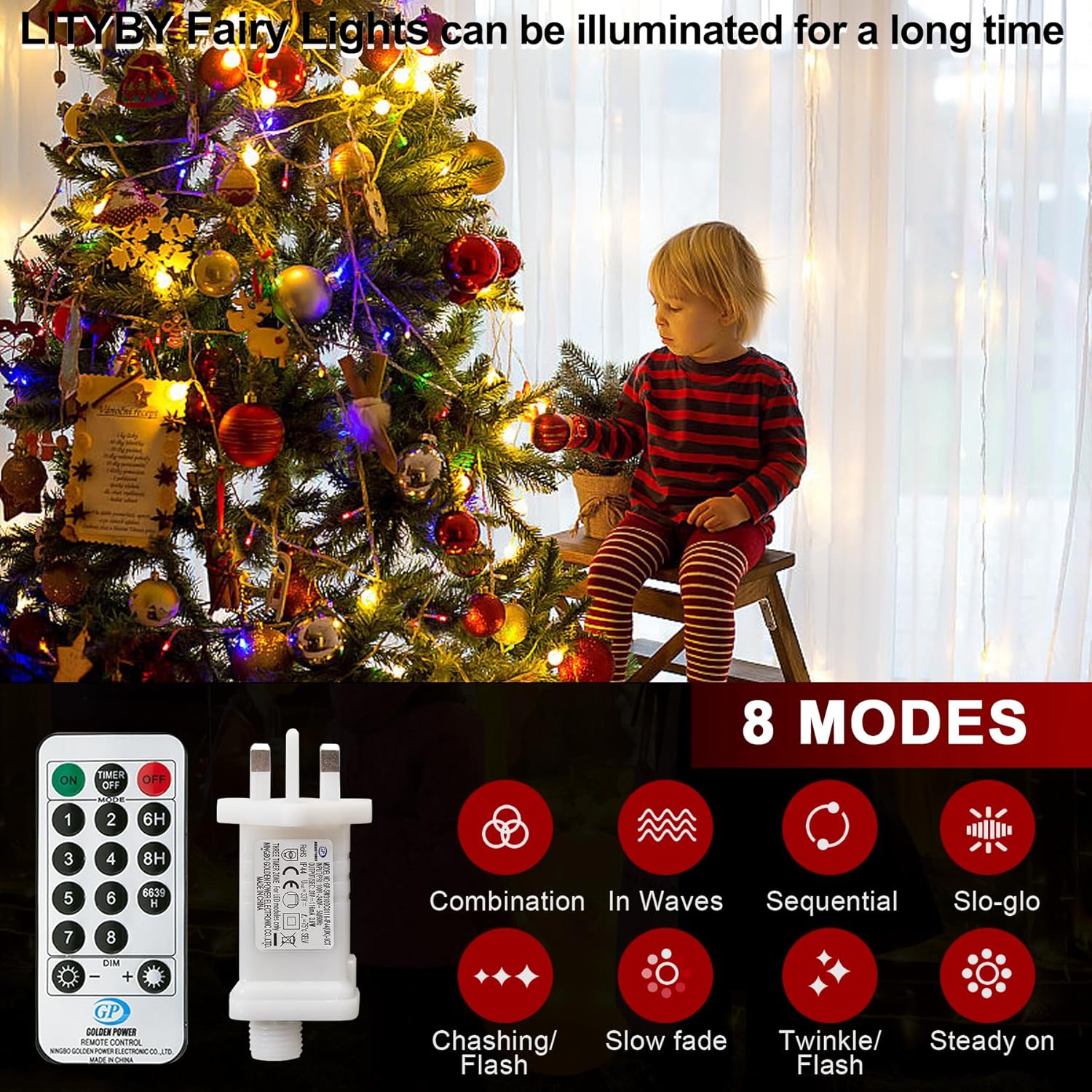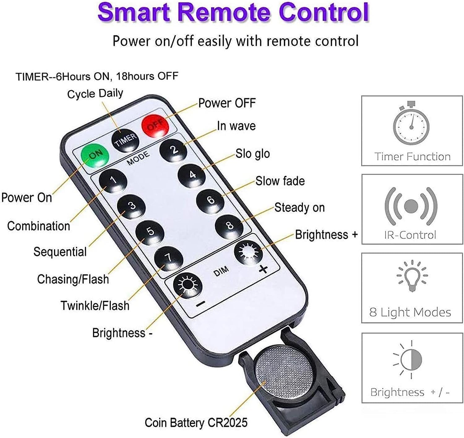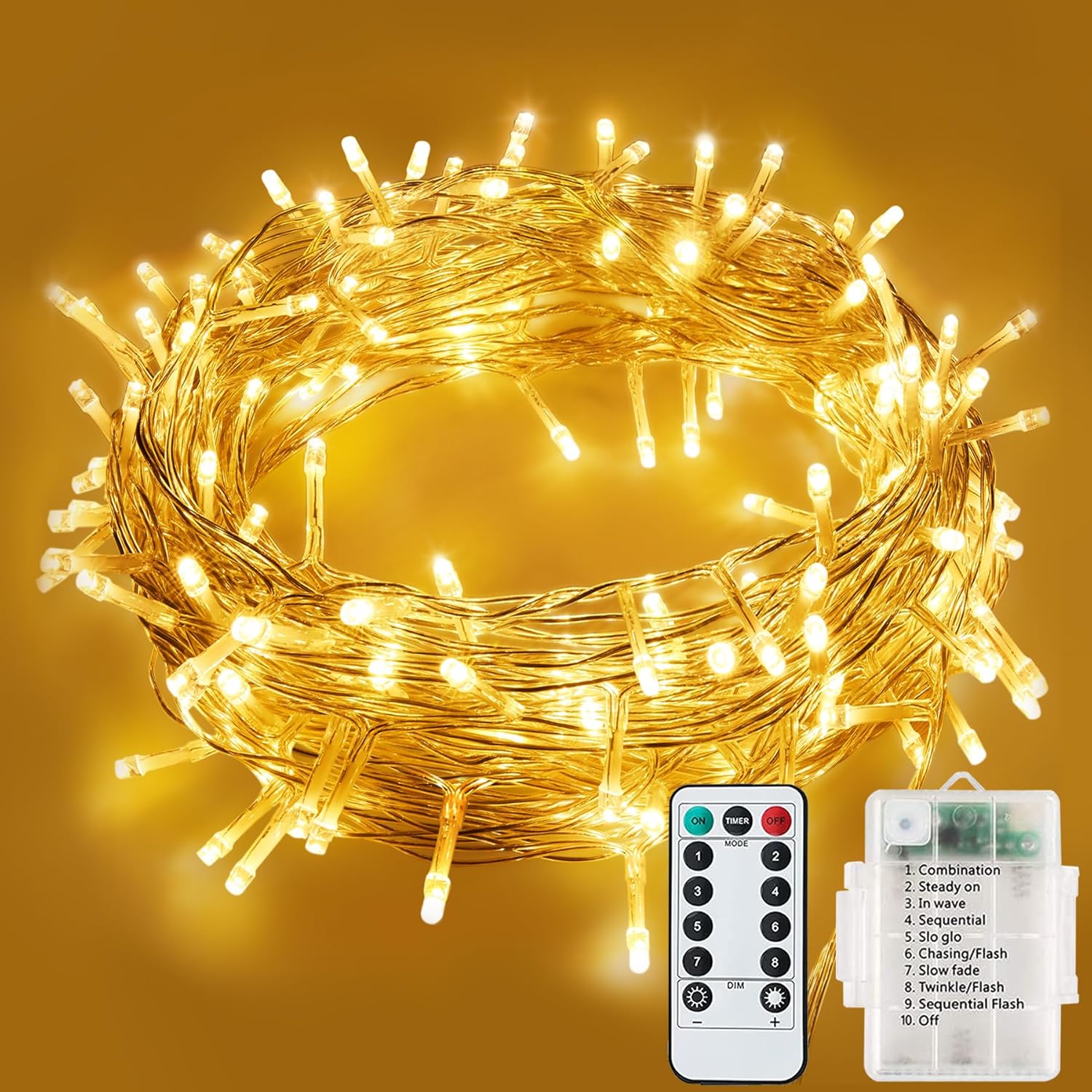 [8 Lighting Modes and Remote Control]: With 8 gorgeous lighting modes including Combination, In waves, Sequential, Slo Glo, Chasing/Flash, Stow fade, Twinkle/Flash, and Steady on, our xmas fairy lights make your atmosphere soft, cozy, and romantic! Press the button “+” or “-” on the remote control to adjust the brightness, and set the mode to suit your environment and scene needs.